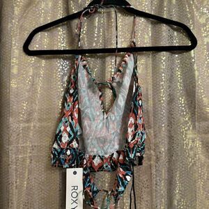 Roxy Tribal Boho Blue Black Orange Tie Back Cropped Halter Top Med NWT