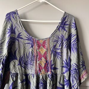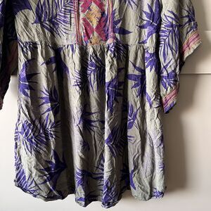 Details: Scoop neck, flowy silhouette, three-quarter length sleeves. Allover gray base with bold purple tropical leaf print. Eye-catching embroidered panel at chest with geometric pink, yellow, and purple stitching. Matching embroidered cuffs. Soft and lightweight, comfortable to wear for warm weather or festivals.