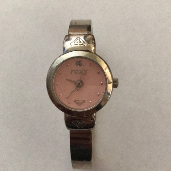 Roxy watch with a pinkish purple face and crystal accent where the 12 o’clock hour should be.