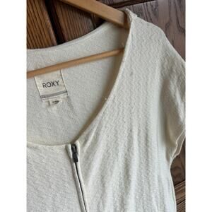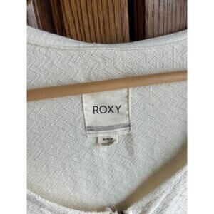 This is a pre-owned Roxy white short sleeve zip up poncho with a fringe bottom.