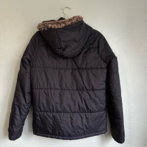 Roxy | Women’s Black Puffer Jacket Pink Zipper Faux Fur Hood Size Small EUC