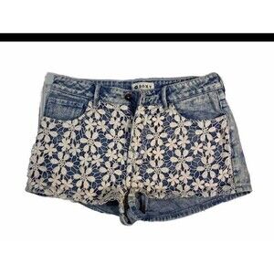 Roxy Women's Crochet floral Pink Acid Wash Overlay Denim Shorts‎ Size 7