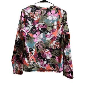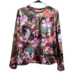 The Roxy Women's UPF 50 Sun Protection Rash Guard Floral Long Sleeve Swim Tee in size L is a stylish and practical top for travel and casual occasions during the summer and spring seasons. The top features a tropical pattern, long sleeves, a round neckline, and a pullover closure for easy wear. Made of a lightweight and breathable polyester blend material, this swim tee offers UV protection, making it perfect for activities like surfing and beach outings. With its classic fit and vibrant multicolor design, this top is a must-have for your beach or vacation wardrobe.