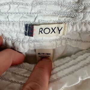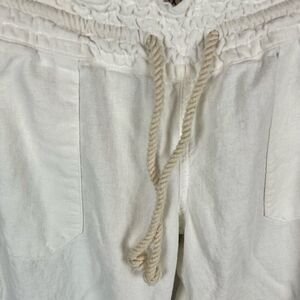 Keywords: Roxy, flared pants, white pants, summer fashion, casual wear, wide-leg, drawstring waistband, linen blend, women's pants, pre-owned, relaxed fit, breathable fabric, side pockets, summer style, casual pants.