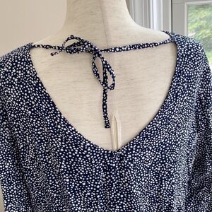 Roxy dress with a loose fit, bell sleeves and open back. Tie at the back of the neck. Wrap style v-neck front. Wide skirt and long sleeves. Elastic at the back of the waist for a fitted waist fit. Navy blue with a white dot pattern. Size Large.