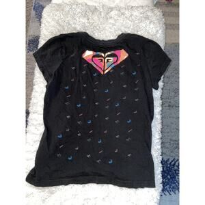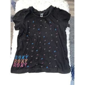 This is a super cute, fun and great quality Roxy girls sz. L black short sleeved multi logo ( small design) tee. Fun, colorful and great summer top. Normal signs of typical, gentle wear, wash &’use. No issues or problems. Fun Roxy top!