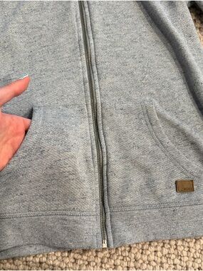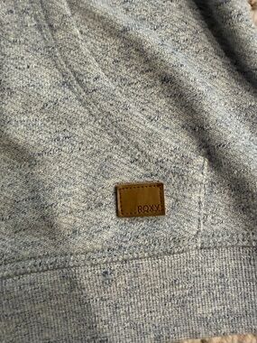 light blue/gray heathered jacket from Roxy. size small. soft interior. 2 front pockets. hood that can be tightened. i've had for a number of years so it did have a lot of stains and discoloration, but i was able to get most of that out. both of the cuffed sleeves might still have some discoloration, but it is tough to tell. i was able to get most of the pilling out with my fabric shaver.