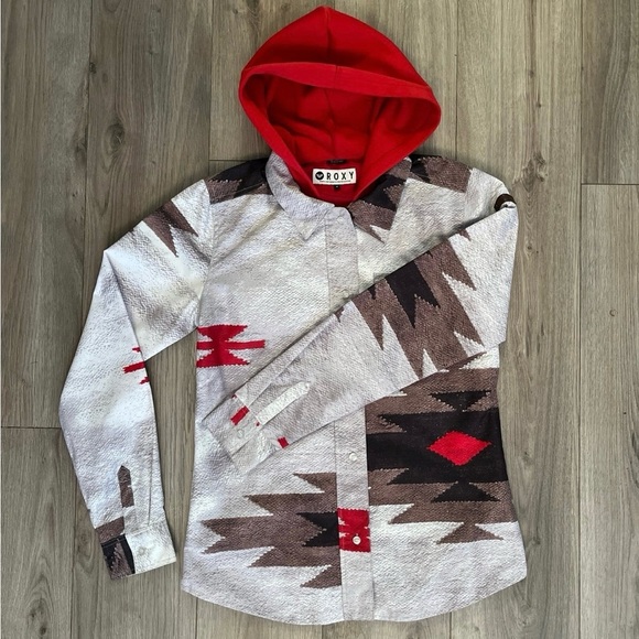 Roxy jacket Aztec style. White, brown, lack and red. Size medium. Light weight. Very good condition only wore a handful of times. Perfect rain coat / windbreaker / fall or light winter jacket.
