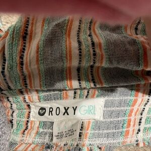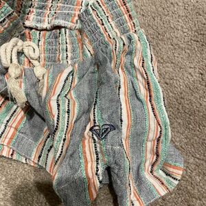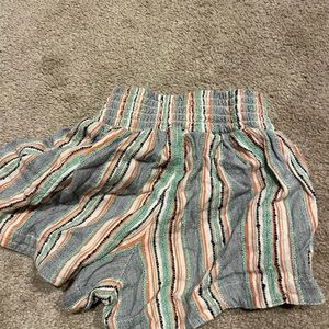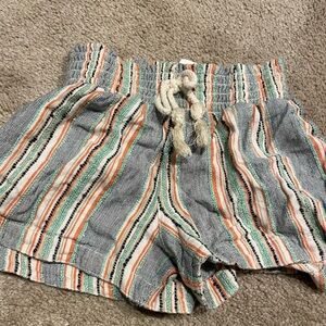 Elastic waist Striped cotton-Blend Shorts. Super cute and comfy pull-on shorts with a relaxed fit and elastic waist. Features a fun multi-color stripe pattern (blue, orange, green, off-white) and a decorative tassel drawstring. Perfect for summer days, beach trips, or casual wear.
