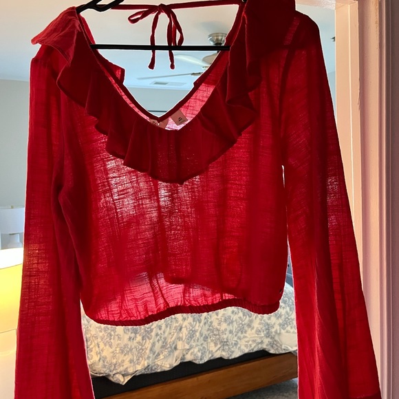 Adorable top from Roxy!! Sleeves are wider at the end and has cute ruffle details on neckline. Cute for going out! Size large