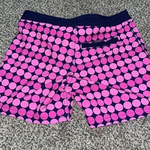 Roxy Board Shorts Navy band Pink polka dots Velcro and tie front Velcro back pocket 13” waist laying flat 4.75” inseam Size 10M