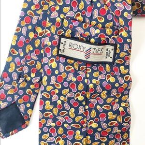 Navy blue ties with yellow, purple and red dot circles and teardrop shapes.