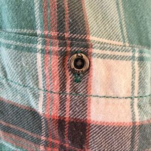 Sea foam green, sunset orange and off white flannel by Roxy. Good pre owned condition. Cute loop detail on the back.