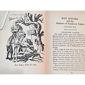 Roy Rogers and the Outlaws of Sundown Valley: Roy and his horse, Trigger, rids the small town of Jackknife in Sundown Valley of the outlaws that have taken over. Along the way, they face off against villains like the Blacky Saunders and the trigger-happy mastermind, Waldo Hadden. 250pp + 2 pages of ads.