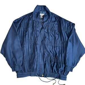 Roy Stock Vintage men’s silk jogging set in navy blue. Unique rouging pattern throughout the jacket with front zipper and drawstring waist. Drop shoulder draping style sleeve.