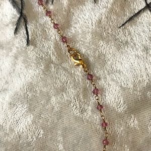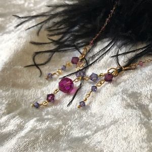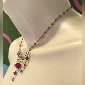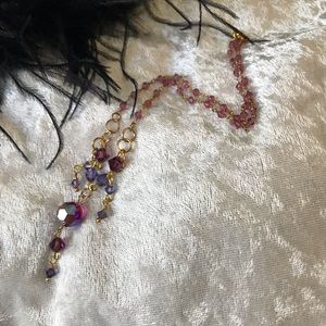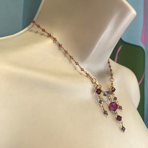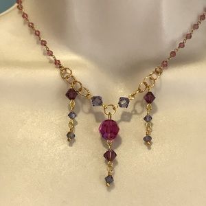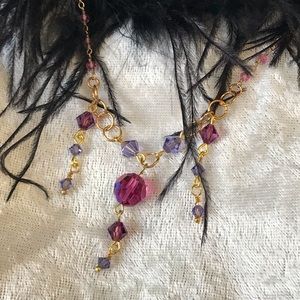 ✨Swarovski crystal beads in various purple hues and sizes, gold-plated jump rings, tiny pink wire-wrapped crystal chain, gold-plated lobster claw clasp closure.