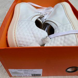The Geometry shoe in white from Royal Albartross. Hand made in Italy. Brand new, but had a production flaw -- the lace tie on the tongue of one shoe is partially detached but it is hard to notice and won't impact usage.