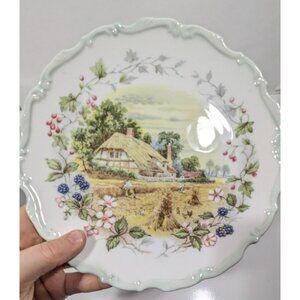 Decorative bone china plate displaying a serene countryside autumn scene. A collectible item from the Cottage Garden Year Series by Royal Albert.
