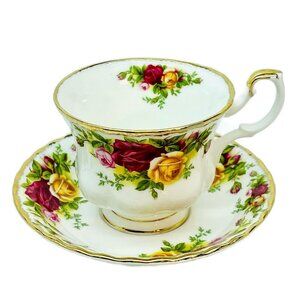 Gilded Cup & Saucer Set In Classic Royal Albert OLD COUNTRY ROSES Pattern. Porcelain Fine Bone China Approximate SizeCup 4.5" Wide With The Handle 3.5" Tall 3.5" Diameter At The Top. Saucer 5.5" Diameter 1" Tall.