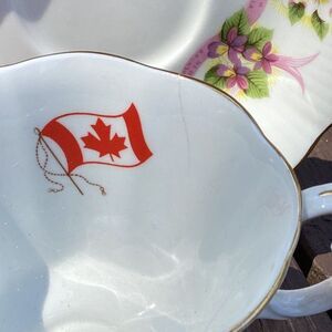 Royal Albert bone china teacup & saucer, “Our Emblems Dear – Canada.” Provincial flowers, gold trim, scalloped saucer; Canadian flag decal inside cup.