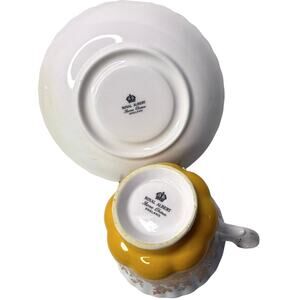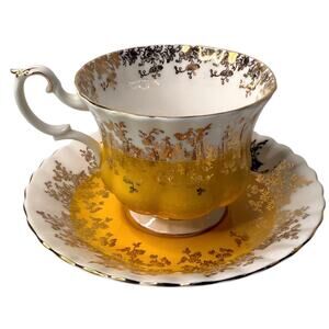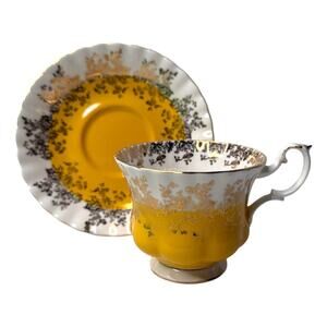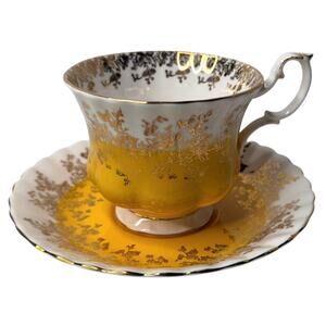 • Indulge in the timeless elegance of this stunning Royal Albert Regal Series tea cup and saucer set, featuring a vibrant golden yellow body complemented by rich gold filigree detailing. Crafted from fine English bone china, this set exudes sophistication with its scalloped rims, graceful footed cup, and ornate handle