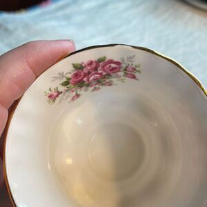 Royal Albert Springtime Series Rose bone China teacup & saucer. One tiny spot of wear of the gold trim shown in pictures. No cracks, chips or repairs.