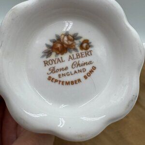 Vintage Royal Albert tea cup and saucer set featuring the elegant September Song pattern. Made in England, this collectible is perfect for tea enthusiasts and collectors alike.