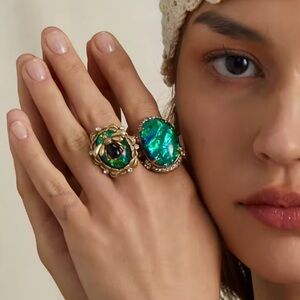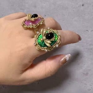 This exquisite ring features a stunning green stone adorned with a gold bee design, perfect for adding a touch of elegance to any outfit.