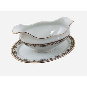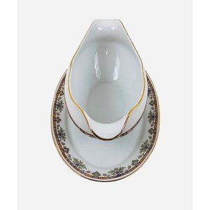 This Royal Beyreuth gravy boat exudes elegance and charm, crafted in Bavaria Porcelain with a delicate floral pattern and lustrous gold trim. The attached underplate enhances the functional beauty of this piece.