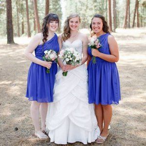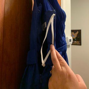 Knee length, chiffon, built in breast pads. Has been altered to waist measurement 33 inches, and shortened shoulder strap.