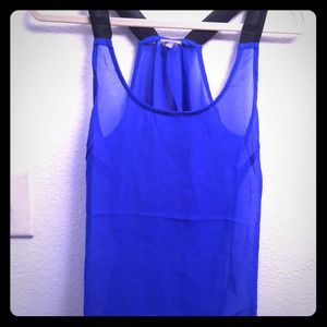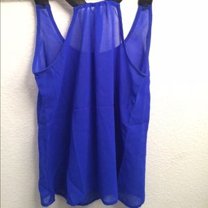 Size: XS. Worn once. This top is a sheer chiffon top with a royal blue base and black racerback straps. Adding a black bandeau, and any bottoms make this top beautiful for anyone! Feel free to ask questions!