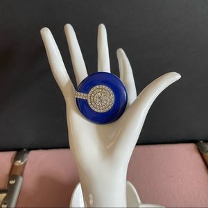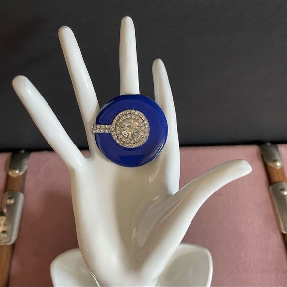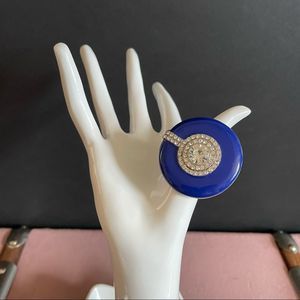 Royal Blue Enamel Round Shaped Stretch Cocktail Ring In Silver Plating - Size 7/9 New