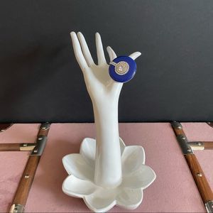 This stunning ring featuring a round shaped design, crafted in silver plated metal. It's covered with blue enamel detailing and encrusted with a thin strip of clear Swarovski crystals running along the middle and side