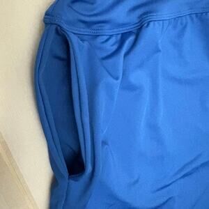 Bright royal blue halter romper with pockets and featuring a soft, stretchy fabric and comfortable fit. It has a cutout in the front. A sleeveless design with an elastic waist and relaxed shorts. Perfect for summer days, lounging, or casual outings. Lightweight and easy to pack for vacations or beachwear. Tagged size Large. Approximate measurements: 18” pit to pit, 31” shoulder to hem. 65% polyester blend.