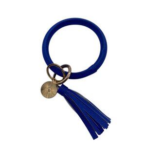 A stylish and functional accessory designed for convenience. This leather bangle keychain features a vibrant royal blue color, tassel charm, and gold-tone hardware.