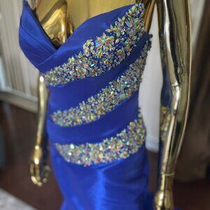 Breathtaking royal blue mermaid formal dress with extensive crystal beadwork in horizontal bands across the bodice. Size 4 gown features classic strapless sweetheart neckline and figure-hugging silhouette that flares into elegant train.