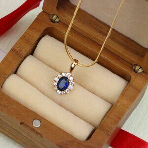 Add a touch of elegance with this deep blue pendant, featuring a rich oval stone surrounded by sparkling halo accents in high-quality gold-plated brass.