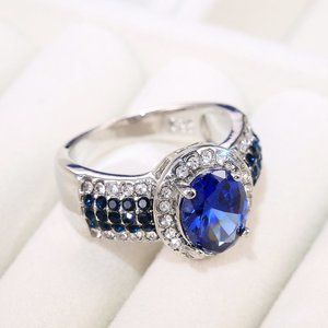 💎 Royal Blue Oval Zircon Multi Row Elegant Silver Trendy Rings for Women,PD550