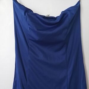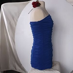 Royal blue unbranded form fitting bodycon dress with ruching. The dress is lined with the same material that The outside of the dress is made out of. The bust has a built-in padded bra area. The last picture is of the inside of the dress. The tag says size large but the measurements are more consistent with a women's size small or a junior's size large. The measurements are as follows*: