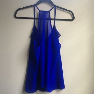 Sheer blue Ruffle Tank. Fits like a medium. Never worn. Beautiful color! Perfect for summer. 100% polyester.