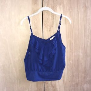 Sheer blue top with ruffles. Adjustable straps, size L but can fit any size by being tucked in / adjusting straps!