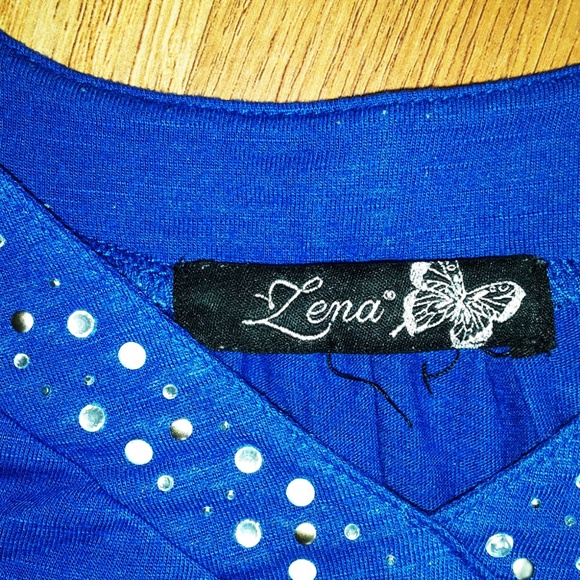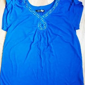 Lena Royal blue short sleeve v-neck loose fitting blouse with keyhole and studding detail around the next, size XL