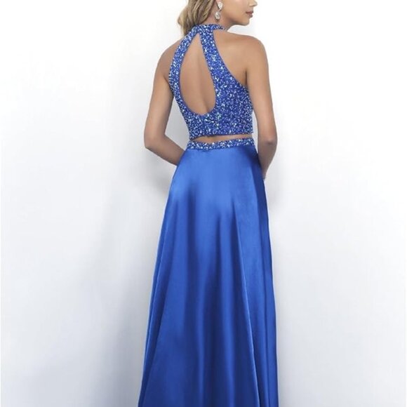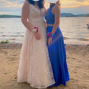 This is a two-piece prom dress worn twice but dry-cleaned after both events. The dress is a size 2