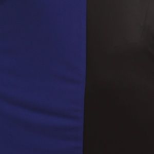 Royal Blue and Black Color Block Dress. Round Neck, bodycon fit midi dress with long faux leather sleeves and cut out shoulders 94% Polyester, 6% Spandex. Made in USA.