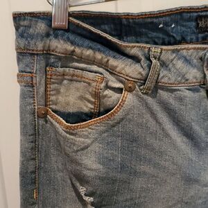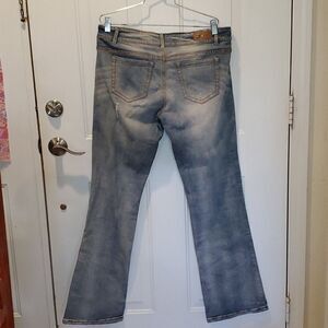 This is a pair of Royal Blue distressed boot cut jeans.