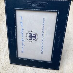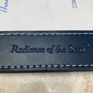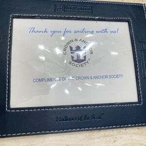 Royal Caribbean Cruise Line Radiance of the Seas 5x7 Picture Frame Blue Faux Leather With Stitching. Stamped on fame Royal Caribbean International with Anchor Logo and Radiance of the Seas. Appropriate Inside frame will fits 5x7 picture. Preowned. Shows some signs of wear marks, scratches, scuffs, discoloration, etc. Center looks like made from plastic shows slight scratches & scuffs. Small Stitch around frame slightly frayed. See pictures.