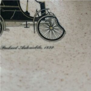 Royal China American Automotive Series 1899 First Packard Automobile Ashtray. 6 1/4”, has a few surface hairline cracks. Nothing goes through the ashtray.
