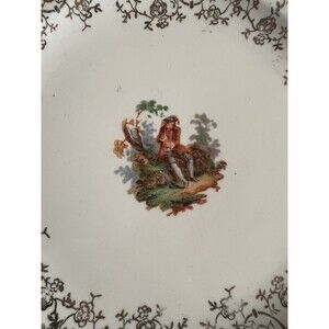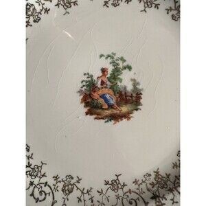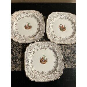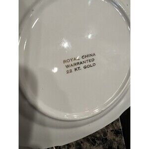Vintage Royal China Warranted 22kt Gold Square Snack Cheese Salad Dessert Plate Square Scalloped Edges. Scene in the middle. Gold lace ornament and pretty pattern around the rim Some crazing. See pics. The mark on the back clearly reads "Royal China," which was the name of a prolific company located in Sebring, Ohio. Royal was founded in 1934 during the aftermath of the Great Depression.
