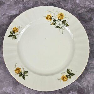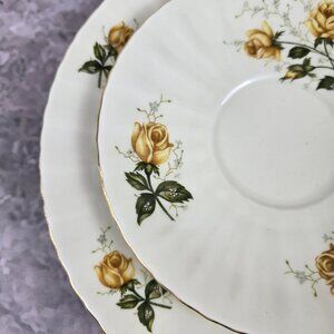 Colorful yellow roses with greenery scattered on a white background on the cup, saucer and bread plate. Gold accents on the handle and base of the cup and around all of the rims. All of the pieces have a wavy texture pattern to the porcelain. Made in Seltmann Weiden Bavaria, West Germany.