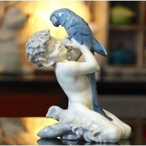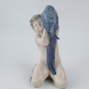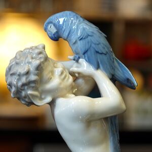 This charming vintage Royal Copenhagen figurine, model #752, depicts a playful faun joyfully holding a large parrot perched on his raised arms. With fluid lines and delicate glaze tones, the sculpture captures a lighthearted moment in exquisite Danish porcelain artistry.